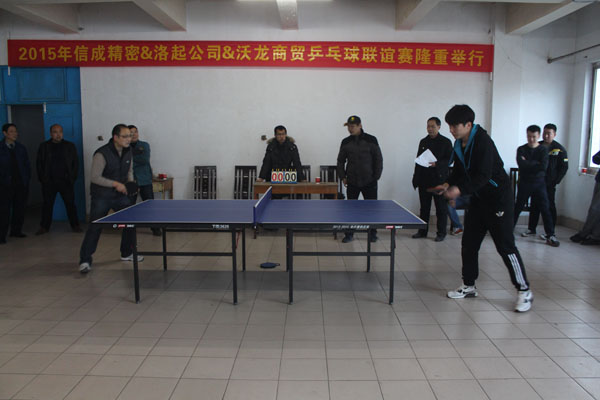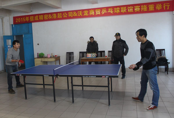 2015年12月31日下午,2015年乒乓球联谊赛在公司举行,信成精密、沃龙商贸和我公司共3支代表队参加了比赛。我公司代表队顽强拼搏、勇往直前,虽然惜败,但也赢得了对方的尊重和场边观众的赞叹,最后,信诚精密获得了联谊赛冠军。